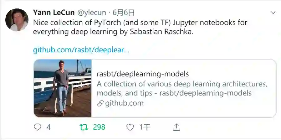 【导读】Yann LeCun在Twitter上推荐了Sebastian Raschka的Github项目“Deep Learning Models”,该项目包含了80个深度模型的教程,由TensorFlow和PyTorch实现,2天获几千赞和星。