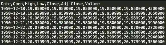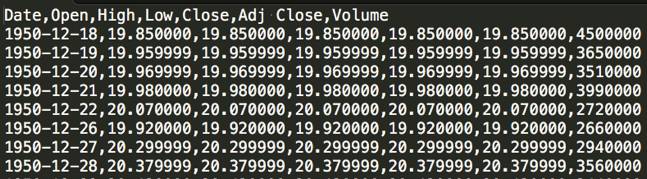 本次实验使用的是一只叫SP500的股票,可以从雅虎下载这只股从50年到现在每天的走势情况,这里只需要关心每次收盘价格,也就是close字段即可。数据截图: