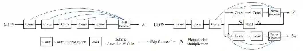 上图(a)是目前比较流行的显著性检测方法的网络结构图,一般都是提取网络结构的浅层和深层feature,并对这些feature进行反卷积,并将反卷积得到的输出进行融合,得到最终的显著性图。
