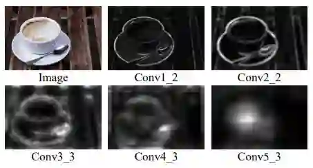 图2 是作者绘制的VGG16不同层输出的显著性结果。发现浅层显著性多集中于边缘信息,深层显著性才比较接近真正的显著性。