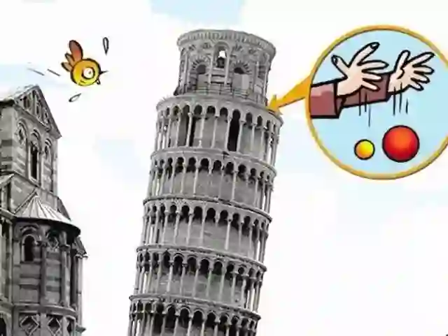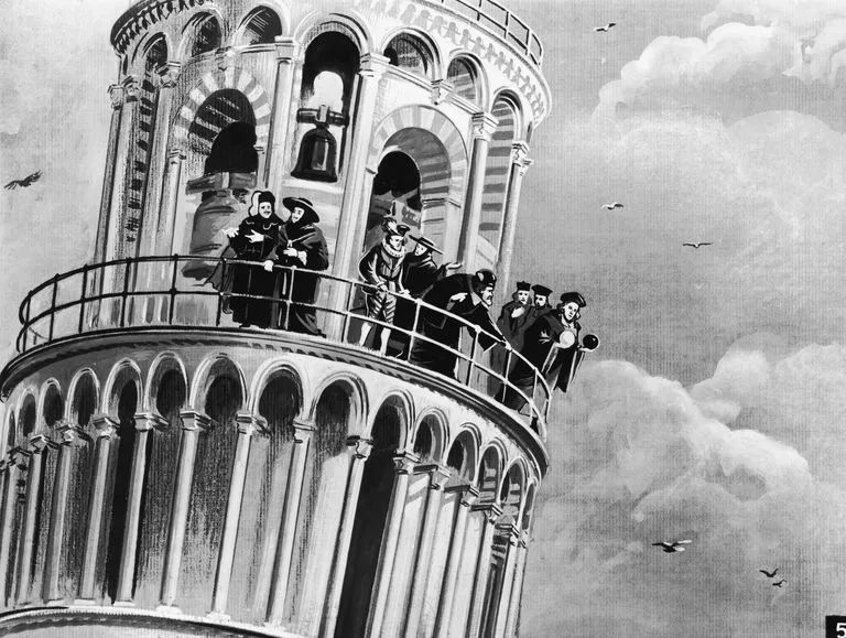 这是一个连小学生都知道的科学故事:古希腊哲学家亚里斯多德(公元前384~322)认为物体的下落速度和重量成正比,物体越重,下落的速度越快。千百年来这被当成是不可怀疑的真理。但是年轻的伽利略(1564~1642)不信这个邪。他在比萨斜塔上当众实验,扔下了一重一轻两个球。在众人的惊呼声中,两个球同时落地。千年的教条被推翻了,一条新的科学定律——自由落体运动定律——被发现了。