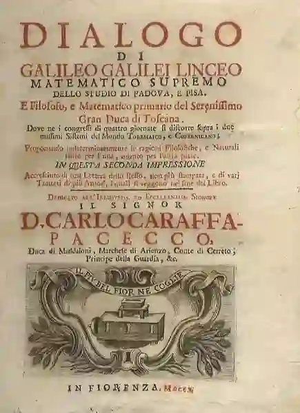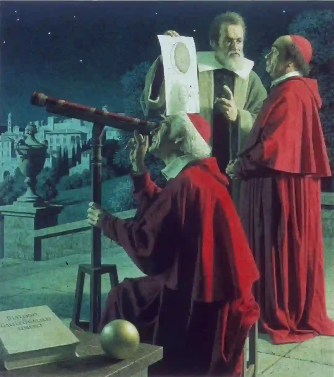 六年后的1632年,伽利略的著作《关于托勒密和哥白尼两大世界体系对话》正式出版。他写这本书的时候,也使了一把坏,表面看起来的中立思想,其实完全偏重日心说,还暗戳戳含沙射影讽刺教皇和主教思想顽固不化,跟不上时代步伐。