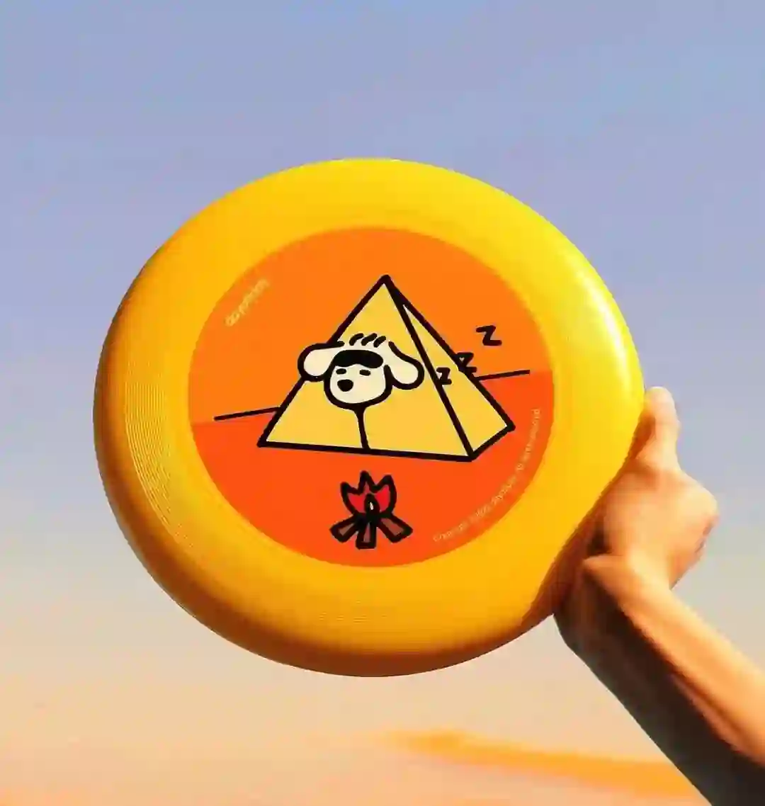 玩飞盘的第一步,先选一块好看的盘。这个小狗飞盘真是不二之选,小狗和我看了之后都开心得不得了!飞盘上的小狗在睡觉,天上的太阳在西沉,不要太安逸哦。