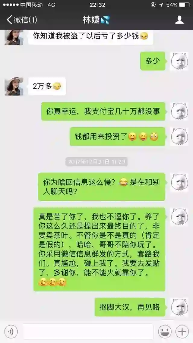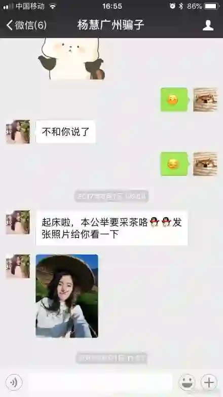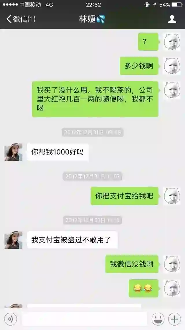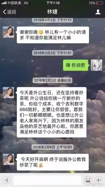 我也遇到过啊!差不多一毛一样!说以为我是她大学同学,聊了一个多月吧,然后她辞职回老家,外公外婆也是在武夷山,然后跟外公学做茶,然后有一天问我喜不喜欢喝茶,可以给我寄一点,我说这么好啊,就把地址给她,然后她居然说要六百多,我就说不是送给我尝尝么,后来就没有要了…现在都这套路了吗