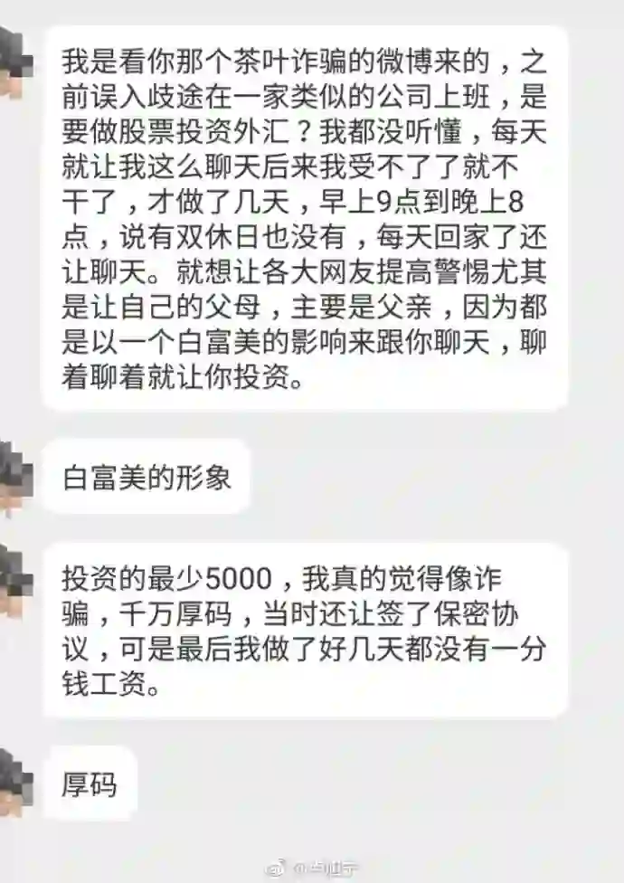有一位网友提醒的很对,对这种卖茶叶诈骗,一般上微博的网友都有分辨能力,不会轻易受骗。但是上年纪的父母一辈人,一定要告诉他们提高警惕,因为这些云养的小姐姐主要诈骗目标就是他们。
