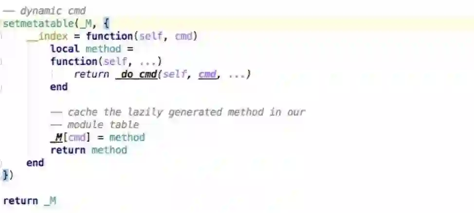 而在lua里,就可以使用lua特有的特性:惰性生成动态方法,以最精简的方式cache下所有redis的命令, 并且甚至为将来redis版本可能添加的方法预留了位置:(有兴趣的同学可以看下lua元表里的__index)