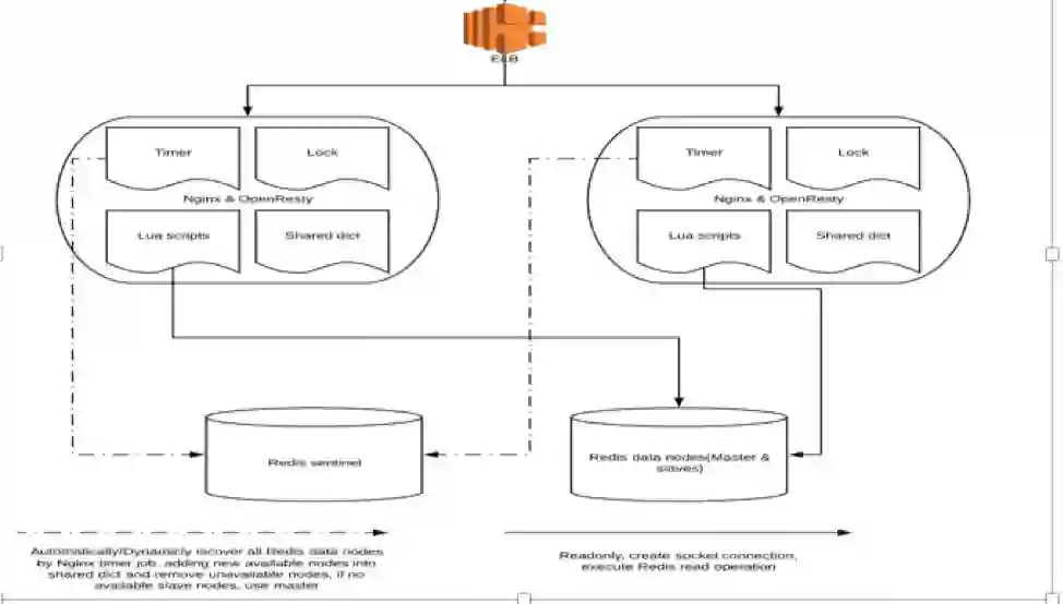 之后,team对openresty的经验积累也多了起来。我们设计了项目在AWS上的framework,以定期通过sentinel自动发现所有可用的redis节点并且存到shared dictionary里供所有openresty的process使用(ngxtimer+resty-lock+shared dictionary), 并且平稳从IDC过渡到AWS。架构图如下: