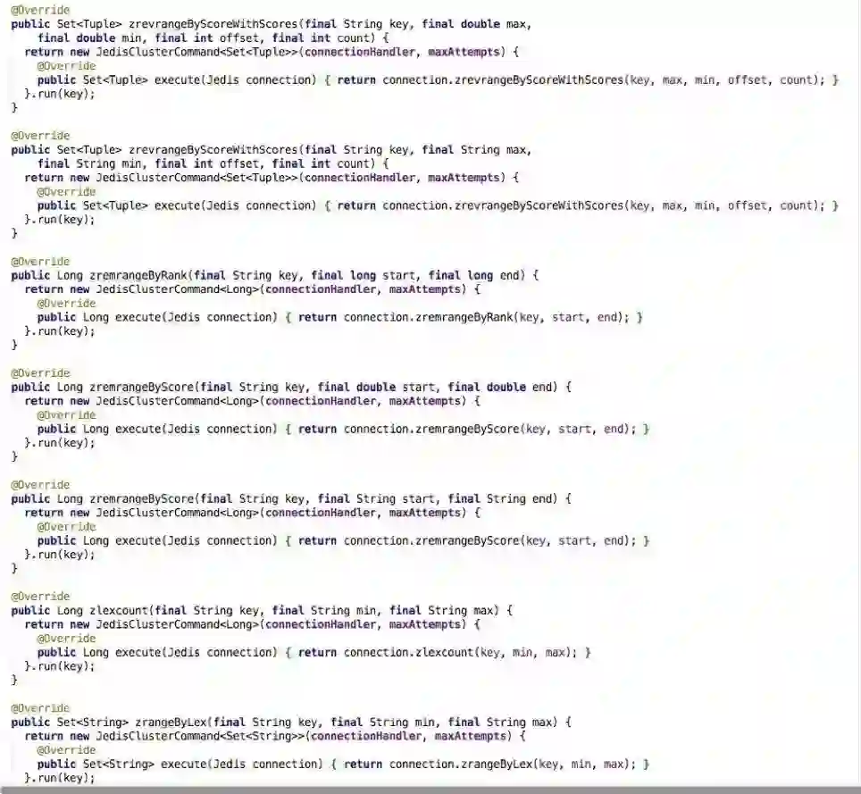 我个人并不喜欢比较每门开发语言的优劣,每个开发语言在不同场景下都有自己的优势。但是在开发resty-redis-cluster过程中,确实觉得lua作为动态语言的灵活性有时可以让代码更加精简优雅。比如Jedis为每个redis命令都定义了interface,整块代码还是给人很臃肿的感觉: