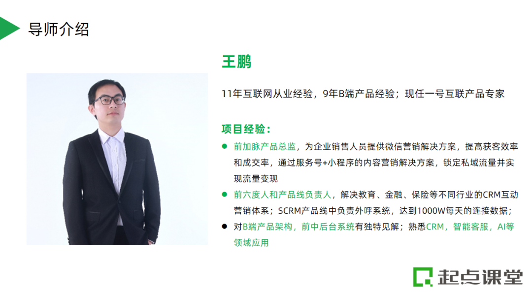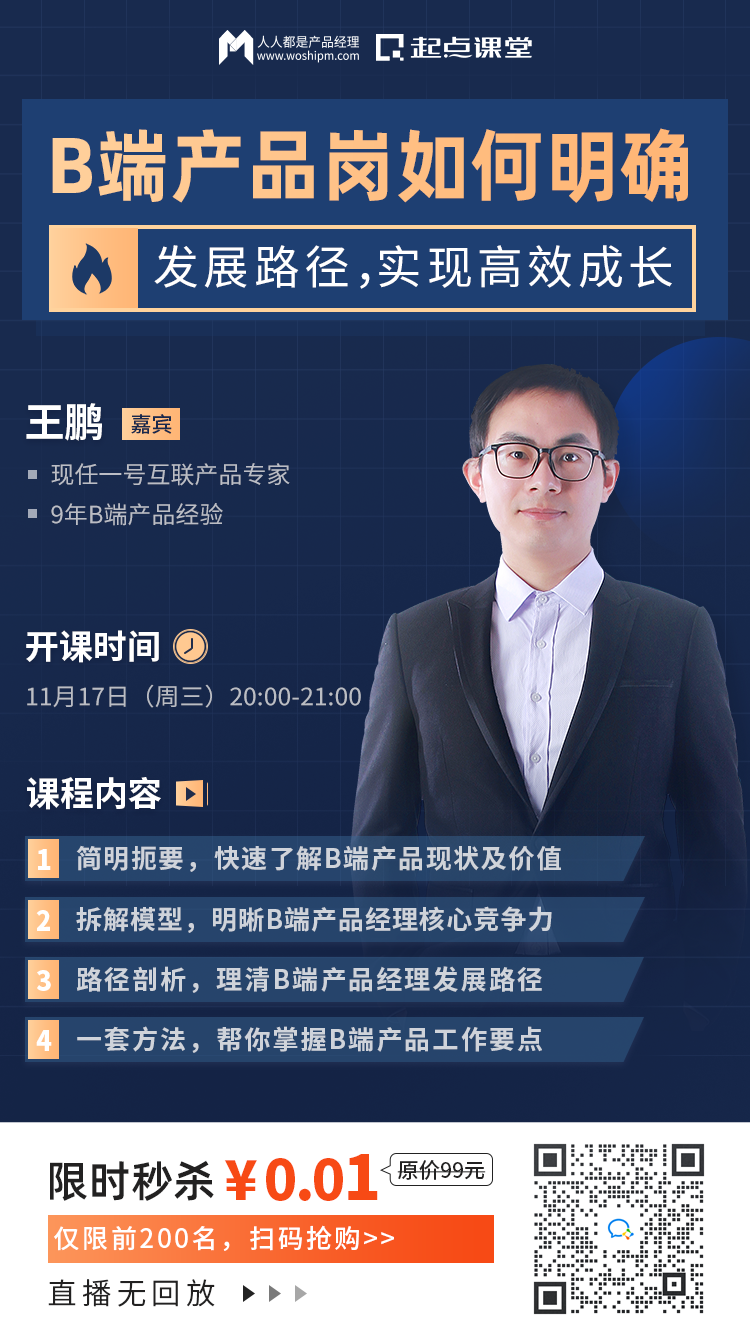 这是由人人都是产品经理社区&起点课堂联合出品,专为1-3岁B端产品经理打造的成长提升和职业发展公开课,并由现任一号互联产品专家@王鹏老师直播亲自授课。