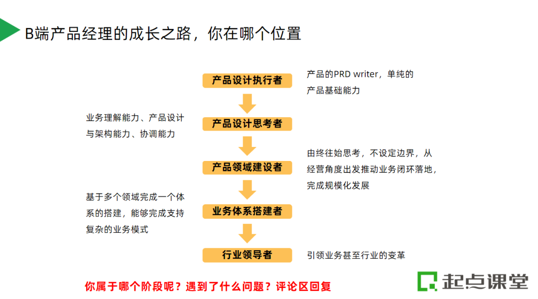 仔细分析下来,造成这些问题的原因其实是:他们对于B端产品经理的成长路径没有清晰的认知,导致职场发展受阻。