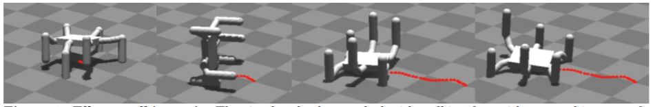 图 6 手肘走路的步态示意图。模拟机器人的任务是在不用脚触碰地面的前提下快速行走,于是它迅速翻了个身并开始用“手肘”走路。红线显示了随着时间的推移机器人质心的变化路径。请注意,忽略模拟刚开始的前十分之几秒,机器人通过将重点放在受限的步态上,而不是初始位置,很快就完成了这个任务。