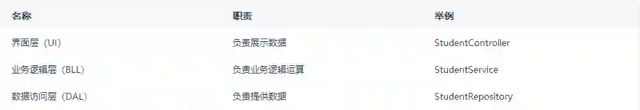 我(程序员B)的工作就是实现IStudentRepository接口的所有方法就行了,简单而明确,至于谁来调用我,我不用管。IStudentRepository里有根据Id获取学生姓名的方法,我实现了就行,至于业务逻辑层拿这个名字干啥,那不是我要关心的事情。