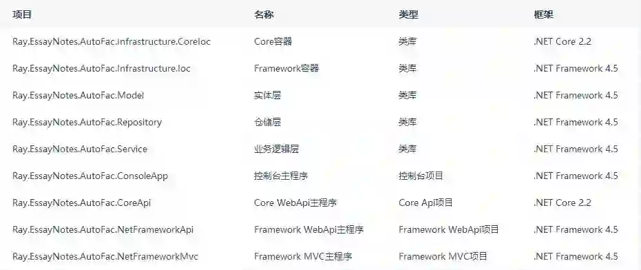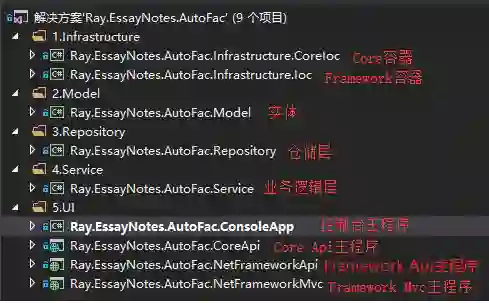 其中.NET Framework框架主要以如何引入AutoFac作为容器以及如何运用AuotoFac为主,.NET Core框架除了研究引入AutoFac的两种方式,同时也运用反射技巧对其自带的DI框架进行了初步封装,实现了相同的依赖注入效果。