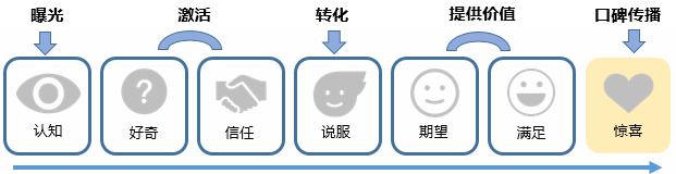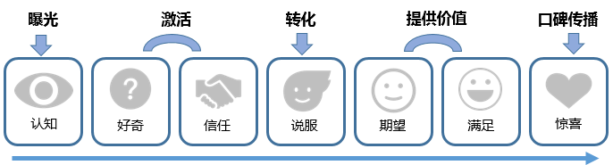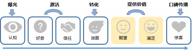 用户消费体验一款商品,会经历7个节点:认知、好奇、信任、说服、期望、满足、惊喜。