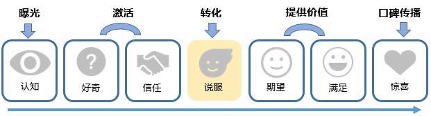 【转化】业务环节对应用户消费体验流程的【说服】节点,在这个节点,用户已经把你的商品服务放在他的购买清单上,作为可购买的对象了。公司业务要做的就是临门一脚,让用户现在行动起来,产生直接的购买行为。