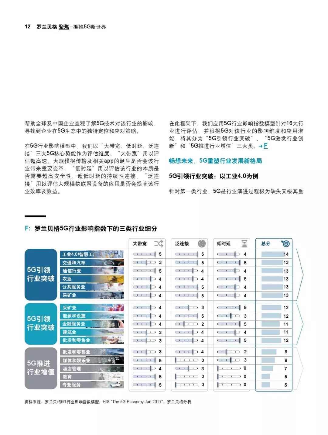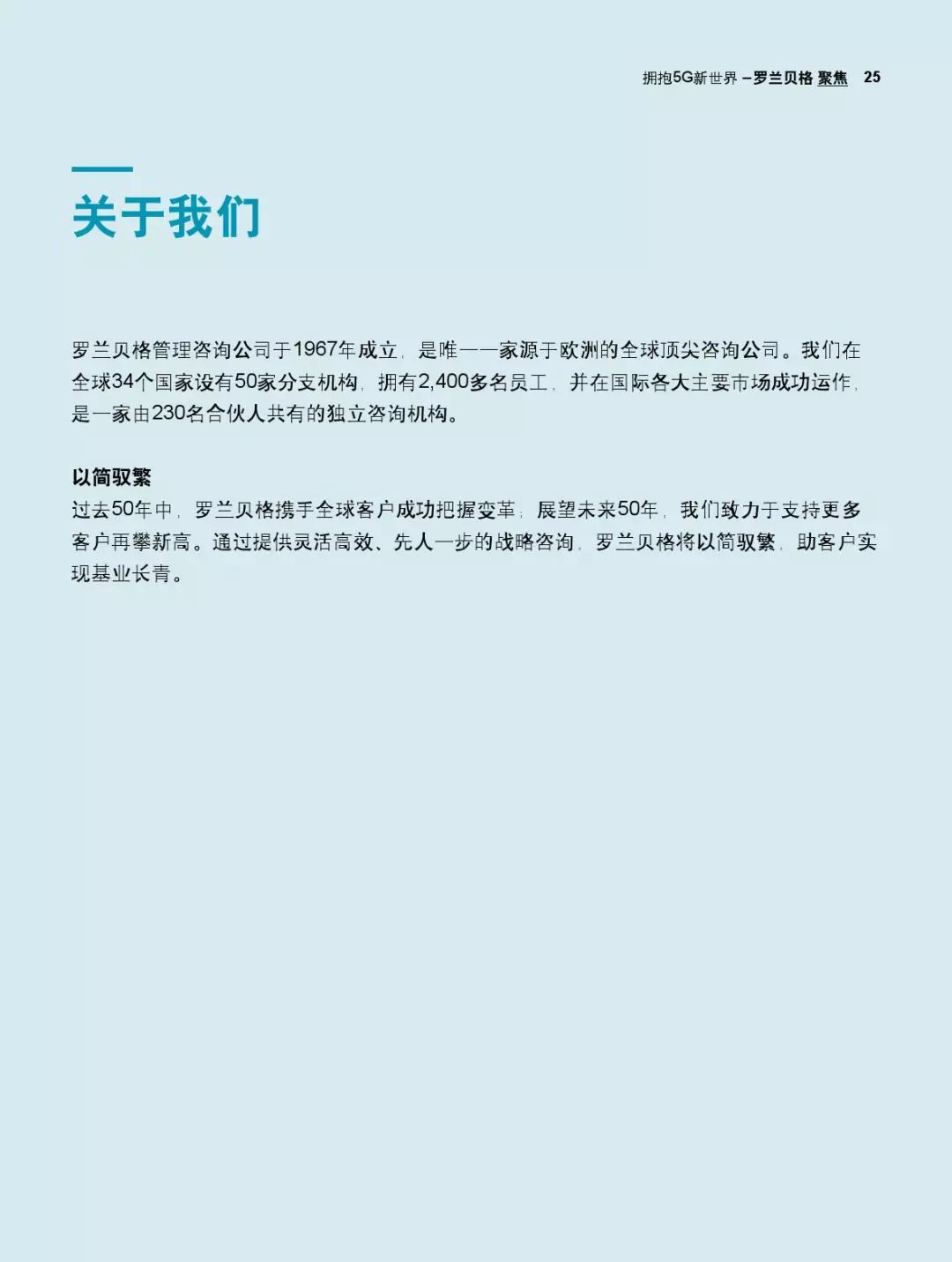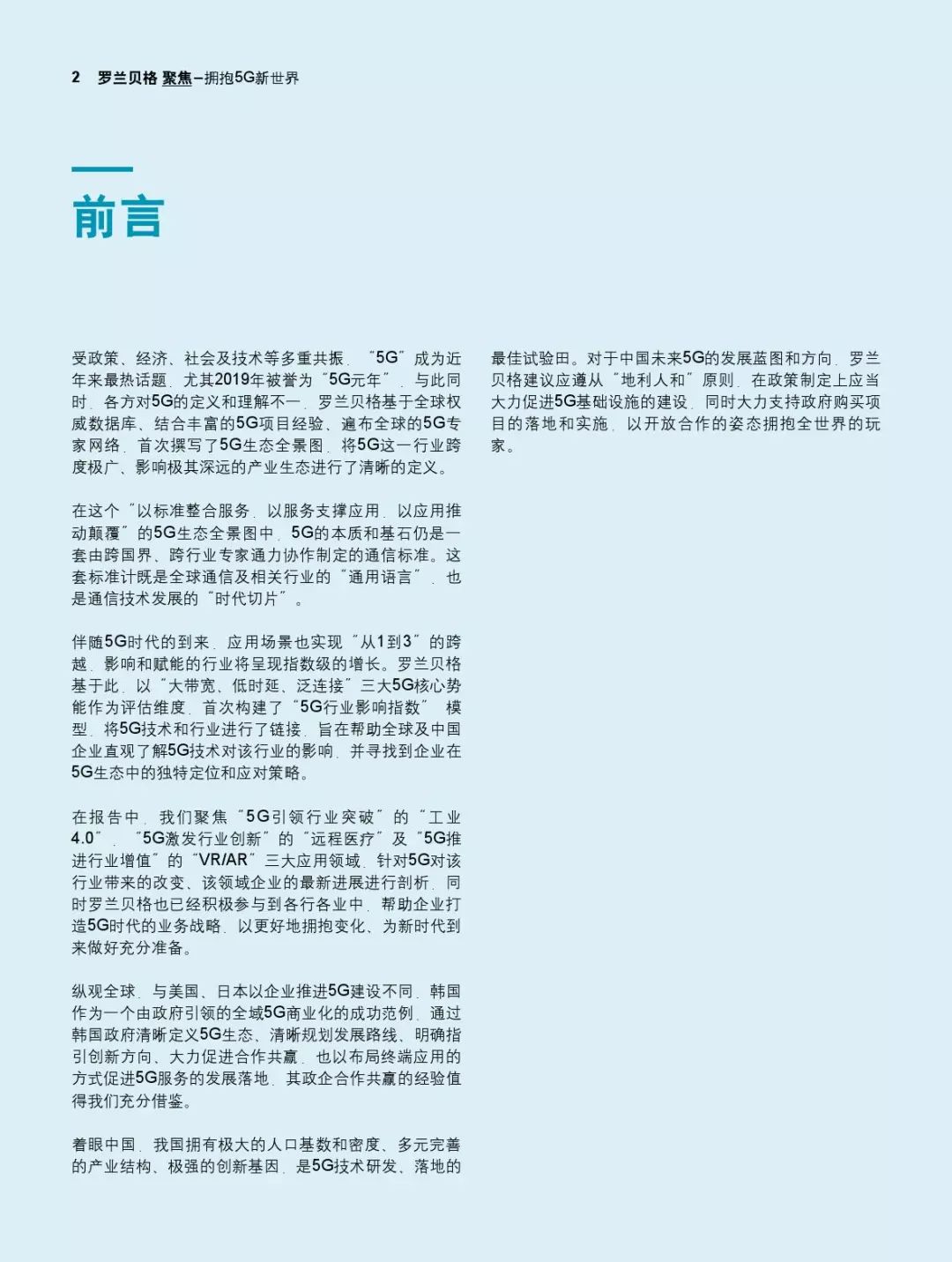 在报告中,我们聚焦“5G引领行业突破”的“工业4.0”,“5G激发行业创新”的“远程医疗”及“5G推进行业增值”的“VR/AR”三大应用领域,针对5G对该行业带来的改变、该领域企业的最新进展进行剖析,同时罗兰贝格也已经积极参与到各行各业中,帮助企业打造5G时代的业务战略,以更好地拥抱变化、为新时代到来做好充分准备。