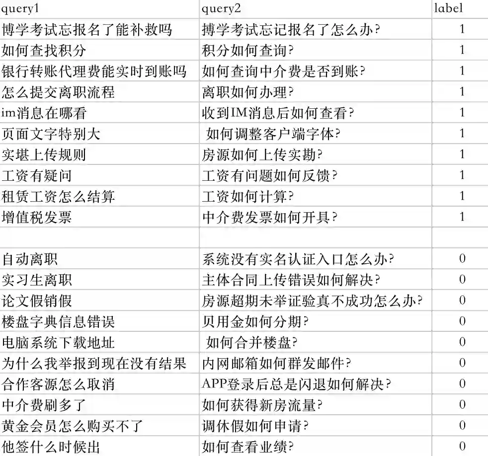 随着标准问数量的增加,知识库中存在大量query和标准问的匹配对,将这些匹配对当作正样本,label为1。将query随机抽取一条与之不匹配的标准问作为负样本,label为0。共产生12w+的训练样本和5000条测试样本,正负样本比例为1:1。标准问是由人工标注总结,因此数据集质量较高,正样本匹配关系很强,数据比较规整。训练样本展示: