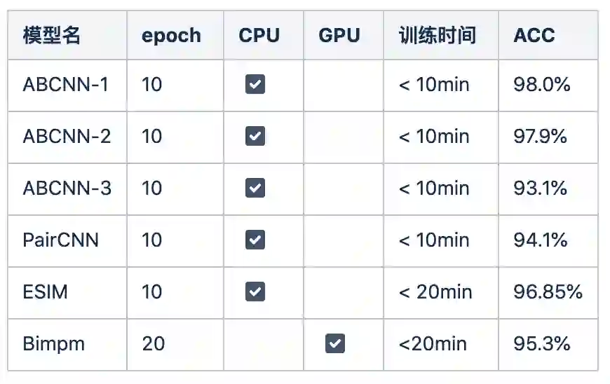 A: Bimpm模型结构相对复杂,从训练时间上和内存使用率上来说,bimpm应该是放在有GPU情况下考虑选择的模型,并且用原文的参数进行训练时会遇到显存用尽的报错,上表中的结果是删掉两层全连接层,并且减少了神经元个数后训练得出的。