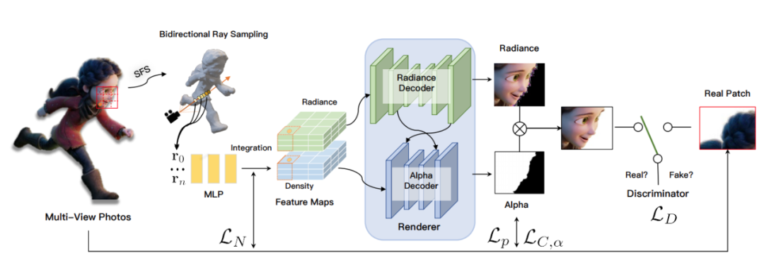 此外,该研究进一步采用 patch-wise 对抗训练方案,以在自监督的框架中同时保留高频外观和不透明细节。该研究还提出了一种高效的多视图图像捕获系统,以捕获挑战性模糊目标的高质量色彩和 alpha 图。在现有数据集和新的含有挑战性模糊目标的数据集上进行的大量实验表明,该研究提出的新方法可以对多种模糊目标实现高真实感、全局一致、外观精细的不透明自由视角渲染。