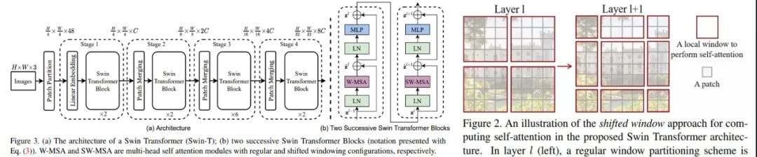 Swin Transformer 架构图(左),移动窗口示意图(右)。