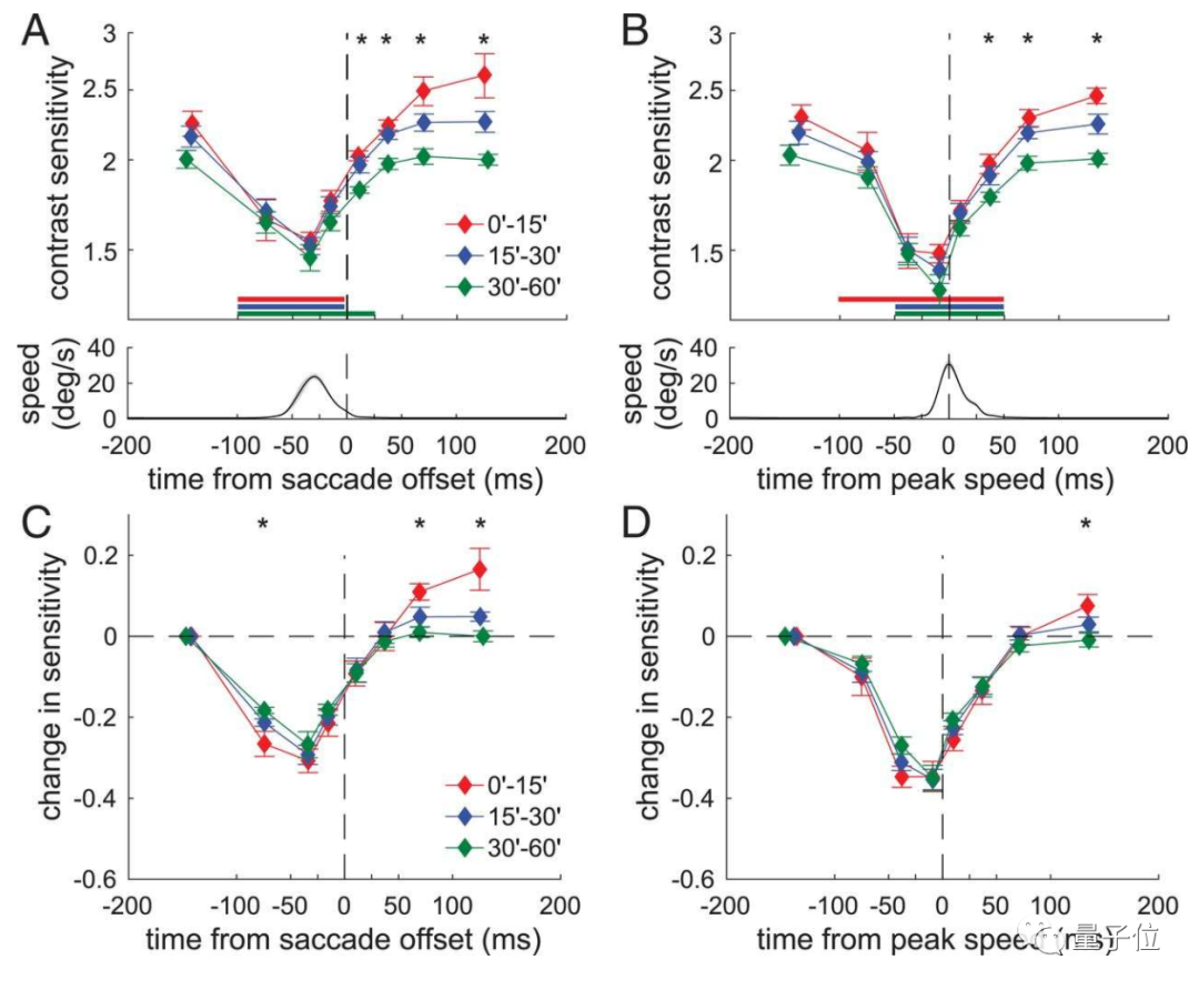 平均而言,在黄斑区域,微眼动结束后不到25毫秒的时间内,灵敏度已恢复到之前90%,之外区域也能在25毫秒内完全恢复。