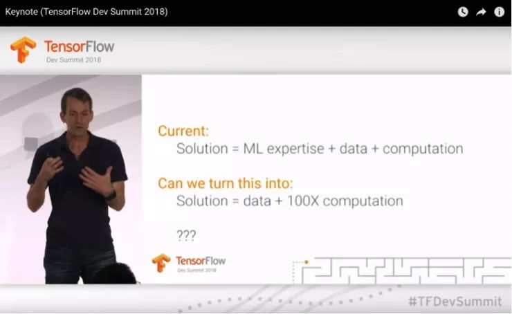 在2018年3月举办的TensorFlow DevSummit大会上,Jeff Dean在主题演讲(大约22:20左右开始)中宣称,未来谷歌可能会用100倍的计算能力取代机器学习专家。 他给出了需要庞大计算力的神经网络结构搜索作为例子(他给出的唯一例子),来说明为什么我们需要100倍的计算能力才能使更多人能够使用ML。