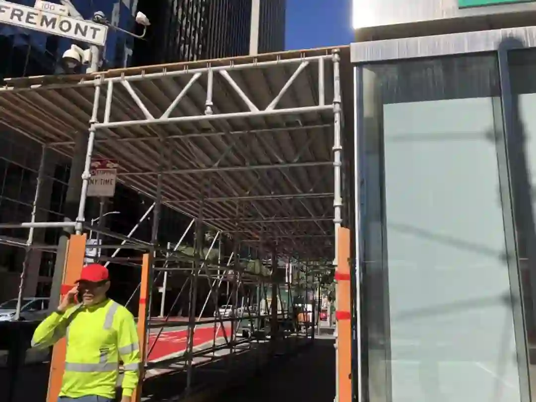 当硅星人在本周来到千禧塔时,玻璃破裂一侧楼下已经搭起了保护行人的架子。人们从楼下走过时会不由自主地加快步伐匆匆穿过,然后朝楼顶上投去担心的一瞥。