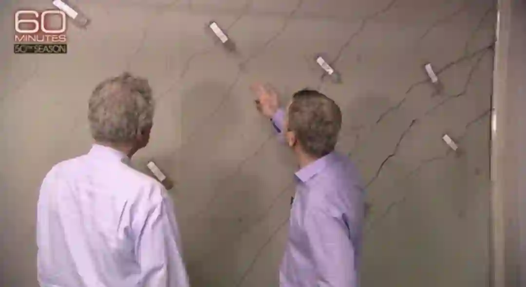 塔内的情况更加糟糕。在 CBS 拍摄的影像中,千禧塔地下车库墙上布满像蛛网一样的裂缝,有些裂缝甚至从地板绵延到天花板。在墙上的裂缝上有数十个应力计,正以毫米为单位默默记录着裂缝的缓慢增长。