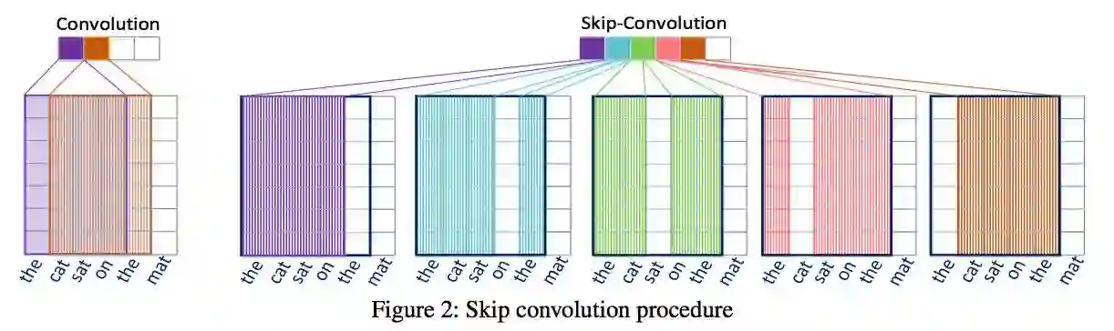 如上图所示,左侧传统卷积方式将卷积窗口作为一个整体,自左向右每次移动一个单词的步长进行卷积操作。相比而言,跳跃卷积则是同样自左向右每次移动一个单词的步长,但移动的并非卷积窗口的整体,而是整体中的一列。例如,上图右侧,初始卷积抽取了短语“the cat sat on”(紫色框)的特征;而后将覆盖在“on”上的卷积窗口的那一列向右移动一个单词的步长,从而得到短语“the cat sat the”(蓝色框)的特征;接着,将覆盖在“sat”上的一列向右移动一个单词的步长,从而得到短语“the cat on the”(绿色框)的特征,以此类推。