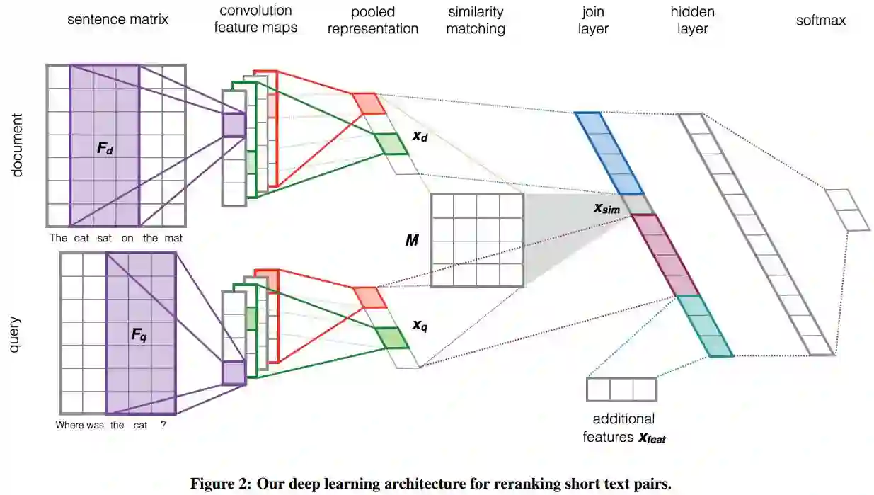 如下图所示,是Severyn发表在2015年SIGIR上的文章[5],并用于TREC上的两个NLP任务:答案选择和微博检索。以答案选择任务为例,从左至右,作者采用上下并行的双通道浅层CNN模型来分别学习输入的问题和答案的句子向量表达,然后经过相似度矩阵M计算相似度,全连接层和隐藏层进行特征整合和非线性变换,最后softmax层来输出输入候选答案被预测为正确或者错误的概率。左半部分的双通道CNN即可理解为学习从词向量到句子向量的表达模型。