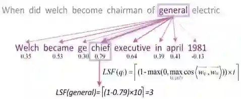 问题和答案中的每一个单词都会有一个LSF特征,具体来说是一个[0,t]上的整数值。LSF的计算过程可通过下面一个例子说明,当我们想要求解问题中general一词的LSF特征时,第一步我们需要计算general与答案中每一个词的余弦相似度并选取其中的最大值,因此chief被选取出来。第二步,余弦相似度值的最大值0.79将通过一个映射函数映射为一个[0,t]区间的整数,当我们假定t=10,最终计算得到general的LSF特征为3。这是合理的,general和chief一定程度上是近义词。