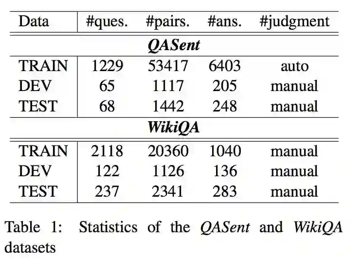 本文在两个公认标准数据集QASent和WikiQA设计全面的实验。下图展示了两个数据集的一些统计信息。