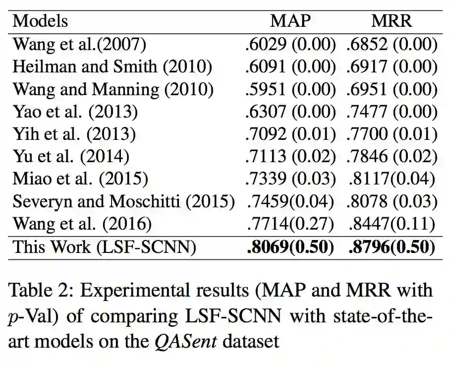 QASent候选答案要求至少与问题有一个非停用单词,而WikiQA中20.3%的答案与问题不存在相同单词,因此WikiQA对LSF技术提出了更高的挑战。