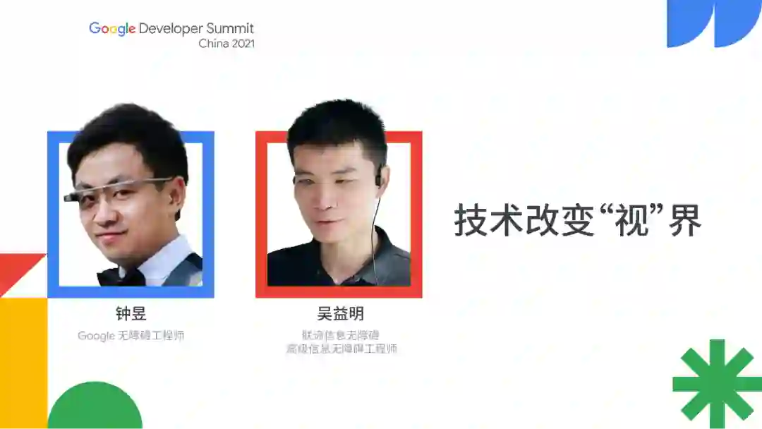 《技术改变“视”界》环节中,来自联谛信息无障碍公司高级信息无障碍工程师,同时本身也是一位面临残障方面挑战的开发者——吴益明先生,介绍了他们如何应用 Google 技术打造更优质的产品,满足用户多样化的无障碍需求,提升用户体验。根据第三方数据,全球超过 15% 的人口面临残障方面的挑战,中国有超过 2 亿人口有无障碍需求,就此,Google 无障碍工程师钟昱说道:“无障碍科技不仅体现人文关怀,更是真正改变用户生活。Google 通过提供无障碍 Codelab 和相关 API 文档支持更多的开发者对产品进行无障碍优化,这是一件非常有意义的事情。希望每个人都可以使用网络并畅享网络带来的便利,我们致力于将这种愿景变为现实,希望能和大家一起努力!”