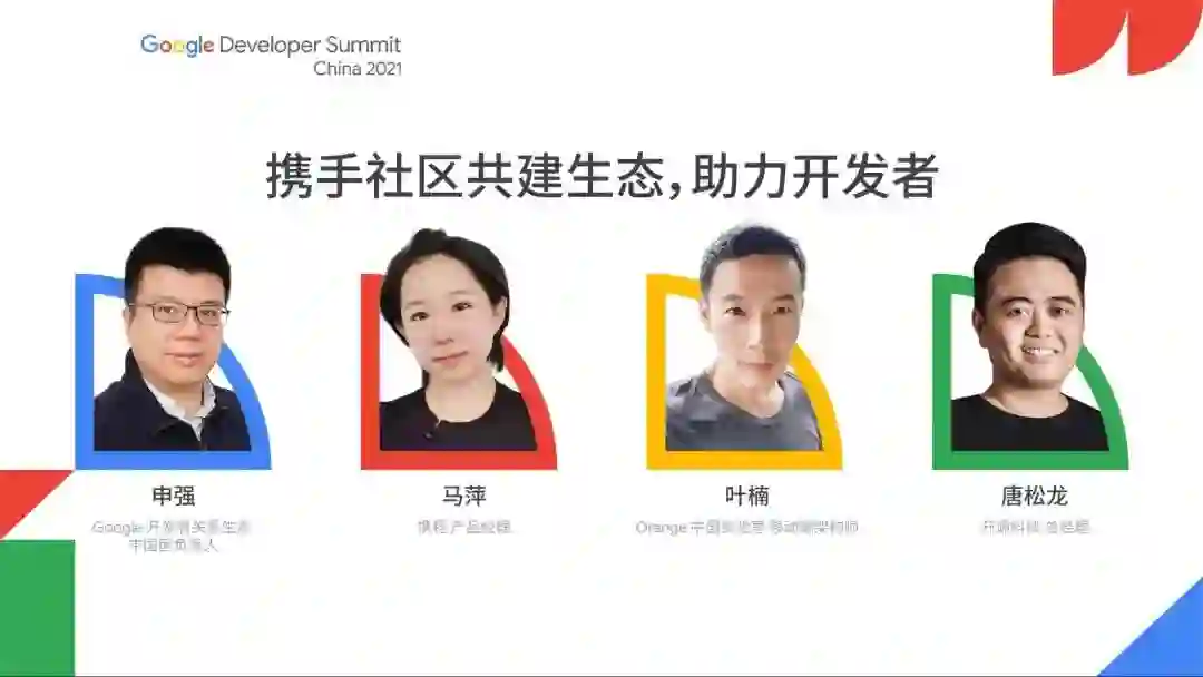 此外,Google 开发者关系生态中国区负责人申强联同携程产品经理马萍、Orange 中国实验室移动端架构师叶楠、开源科技总经理唐松龙,一起商讨了未来如何更好地携手社区共建生态,助力开发者。申强表示,目前遍布全国 27 个城市的 Google开发者社区 (GDG) ,有 36 名 Google 开发者专家 (GDE) ,每年举办超过 100 场次的活动以各种方式与数十万开发者互动,提高对先进技术的认识,提升开发者的职业技能和企业的经济贡献。