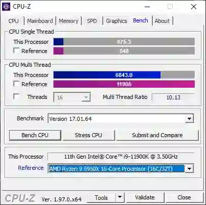 Core i9-11900K 在单核测试中得分为 675.3。在两个跑分结果上,CPU-Z 提供了自己的参考标准,也就是 AMD Zen3 旗舰 Ryzen 9 5950X,它在单核测试中的得分为 648。