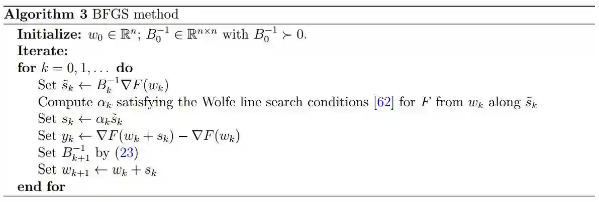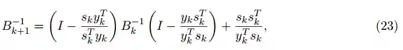 有趣的是,这些方法没有计算出显式二阶导数,而是通过在每次迭代中应用低秩更新构造完全由一阶导数的海塞近似矩阵。例如,让我们简要介绍最流行的拟牛顿算法,全称为 Broyden-Fletcher-Goldfarb-Shanno(BFGS)方法。在这种方法中,我们首先可以看到(21)的最小值为、进一步发现它实际上可以方便地计算出逆 Hessian 近似。由于