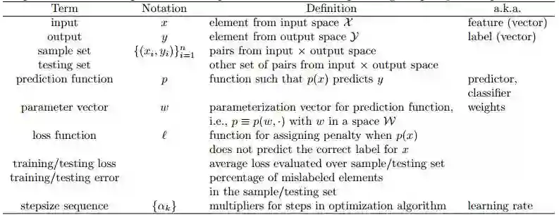 表 1 : 监督机器学习的术语表(监督机器学习的目的之一就是理解输入空间 X 中每个输入向量 x 和输出空间 Y 中相应输出向量 y 之间的关系)