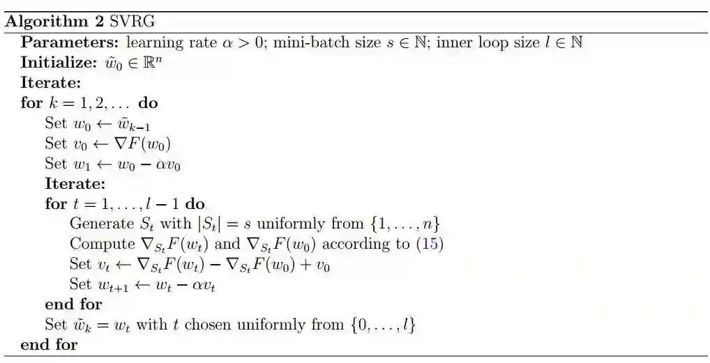 为了方便引用,我们把 SVRG 叫做算法 2。该算法在每个外部迭代中执行一次完整的梯度计算,然后沿着随机方向再迭代 L 步,这是整个梯度的随机修正过程。内环步长 L(inner loop size)必须满足一定的条件以保证收敛 [ 44 ]。