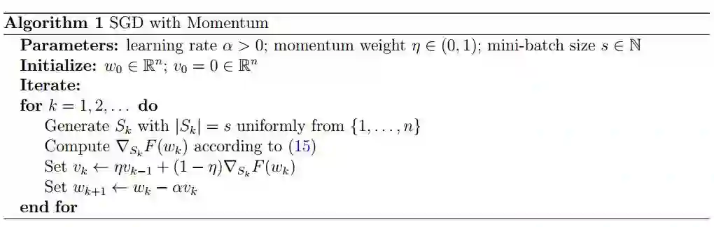 然而,在实际运用中,标准的 SGD 并不一定是解决机器学习中优化问题的最有效方法。事实上,机器学习和优化算法领域在开发改进或替代 SGD 方面进行了大量的积极研究。在随后的两部分中,我们将讨论两类方法:方差缩减法和二阶方法。但是在这两类方法以外,还有多种方法。例如,加有动量的 SGD 就是一个实践中被发现的性能好于好于标准 SGD 的拓展版 SGD。见下图算法 1