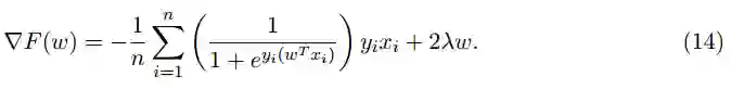 这一类中包含很多机器学习模型,包括支持向量机、Lasso(Least Absolute Shrinkage and Selection Operator)、稀疏逆协方差选择等。有关这些模型的详细信息请参见 [86] 和其中的参考文献。为了每一步都能具体(展现出来),此处我们指定以二分类的正则化logistic回归为例(进行讲解)。为了简化例子中的符号,我们作不失一般性的假设,令。(此处省去了偏置项 b0),这一省略操作可以通过在输入向量上增加一维恒为 1 的特征值来弥补)。当 w 和 x 都是 d 维时就可以令其为特定的凸优化问题。