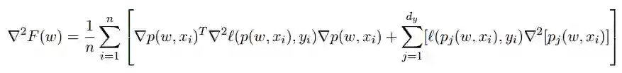 其中是关于第一个参数的损失函数 l(·, ·) 的海塞矩阵,∇p(w, xi) 是 dy-维函数 p(w, x) 对于权重 w 的雅可比式,∇^2 [pj (w, xi)] for all j ∈ {1, . . . , dy} 是关于 w 的按元素运算的海塞矩阵。