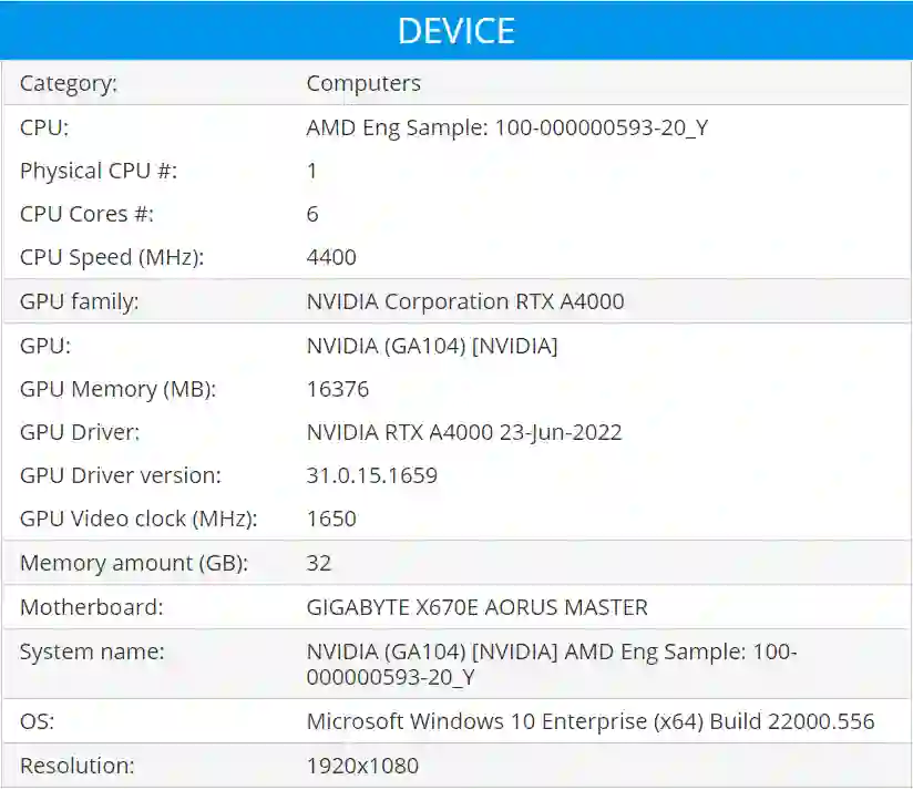 从检测信息中可以看到,该 CPU 拥有 6 个核心,频率是 4.4GHz,CPU 本体很可能是基于 Zen 4 架构的 6 核 12 线程的 AMD 锐龙 5 7600X。测试搭配 32G 内存,RTX A4000 显卡,以及 X670E 主板,该主板只支持 AM5 插槽,因此大概率是 AMD 锐龙 7000 系列新品。