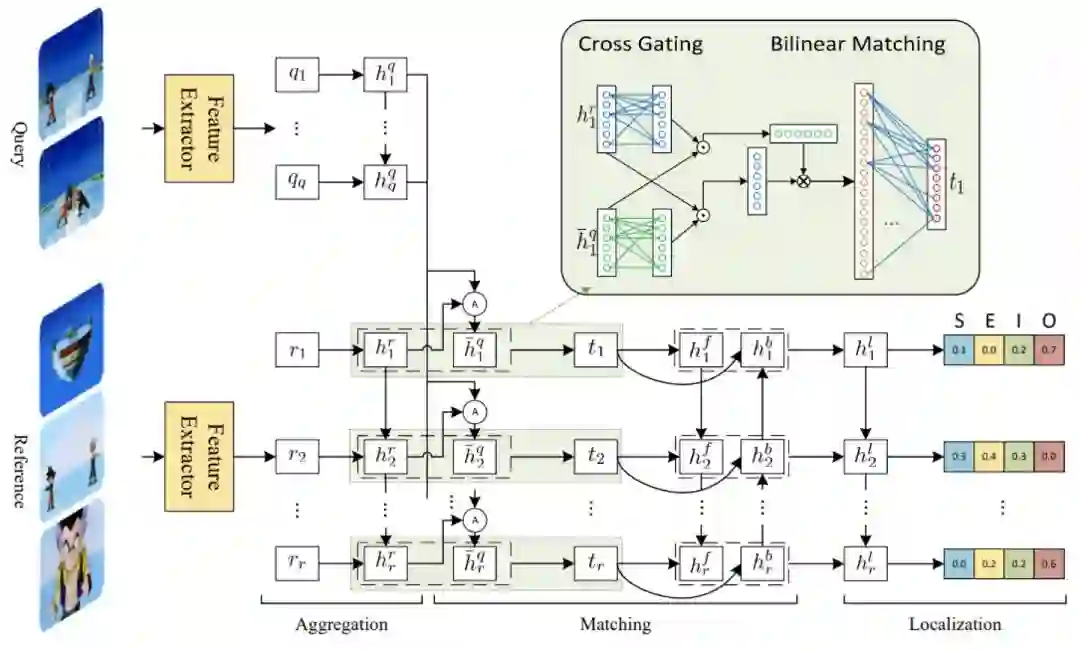 为了解决视频再定位问题,我们提出了一种交叉过滤的双线性匹配模型。对于给定一段查询视频以及一段备选视频,我们首先分别对查询视频和备选视频进行特征提取,然后将查询视频使用注意力机制合并成一个特征向量用于与备选视频匹配。匹配的时候,我们过滤掉不相关的信息,提取相关的信息,然后用双向 LSTM 来生成匹配结果。最后,我们把匹配结果整合,输出预测的起始点和终止点的概率。