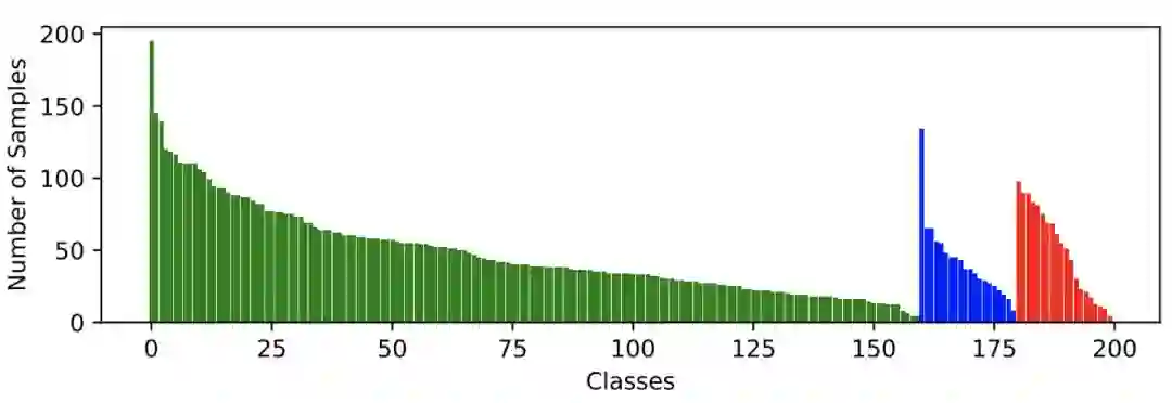 ▲ 图2:本文构建的数据集当中,每类行为当中的视频样本个数。绿色,蓝色和红色分别表示训练,验证和测试用的视频。