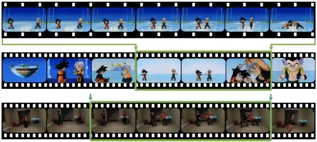 已有的视频处理方法并不能很好的解决这个问题。比如,视频拷贝检测(Video Copy Detection)方法只能检测同一段视频出现的不同位置,拷贝检测不能处理图 1 当中的场景变化和动作角色变化的情况。另外,也很难用行为定位方法来解决这个问题,因为训练行为定位的模型需要大量的行为样本数据,在图 1 的例子当中,我们只有一个数据样本。