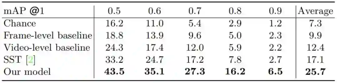 在实验当中,我们设计了三种基线方法。第一个基线方法根据视频帧之间的相似度,计算两个视频片段的相关程度。第二个基线方法把每个视频编码成一个特征向量,然后用特征向量的距离表示两段视频的相关程度。第三个基线方法没有使用查询视频,仅根据备选视频选择最有可能包含行为的视频片段。
