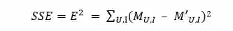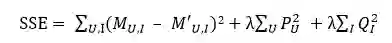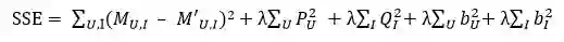 同时,误差E除了由于M‘计算方式带来的变化之外,也同样需要加入U和I偏置的正则项,因此最终的误差函数变成了
