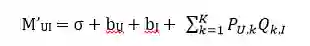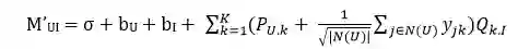 又比如某个物品非常精美,所有用户都会给出较高的分数,这也仅仅与物品自身有关。因此,只通过用户与物品之间的联系来预测评分是不合理的,同时也需要考虑到用户和物品自身的属性。于是,评分预测的公式也需要进行修正。不妨设整个评分矩阵的平均分为σ,用户U和物品I的偏置分别为和