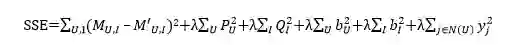 其中 N(I)表示为物品I提供了隐式反馈的用户的集合。类似地,在损失函数中也需要加上隐式兴趣的正则项。